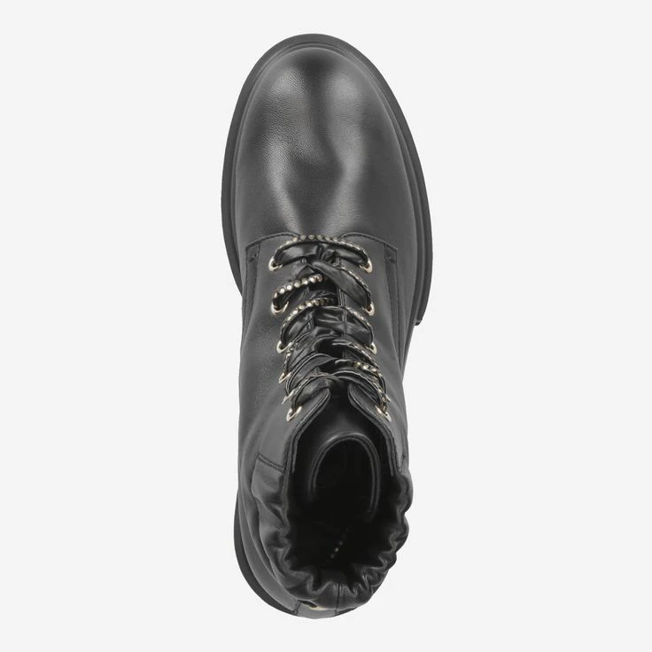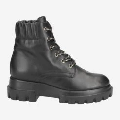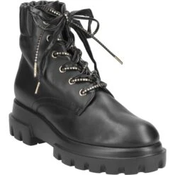 The military boot inspired biker boot „Maxine Lux“ of the new collection of AGL beguiles your senses! You will enjoy the suppleness of the finest black calfskin. The noble character is complemented by playful elements in the form of gold-colored polka dots on the laces, as well as the elastic insert at the ankle. The impressive chunkey sole defines the runway character of these classy Italian designer boots. A statement boot in a class of its own!