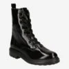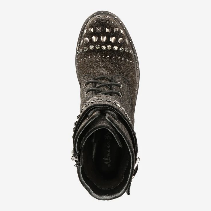 The lace-up boots from Alma en Pena delight with a finish of black-gold upper material with elaborate rivet and rhinestone design on the cap, heel and shaft. Also the sole edge was decorated with rivets and skillfully underlines the rock look of the lace-up. The eye-catching strap closes with two buckles and incidentally puts the shoe in the spotlight.