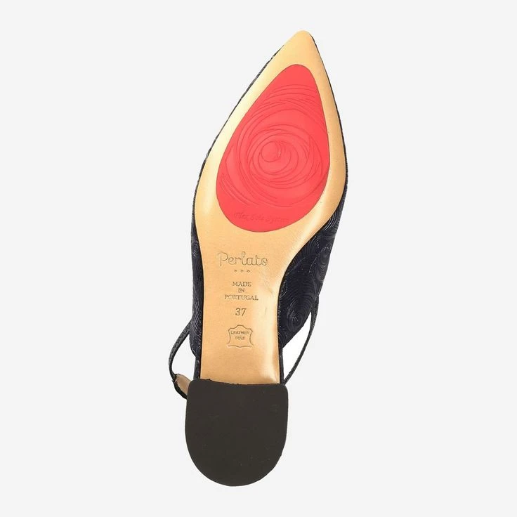 Enchantment can be excellent from this model in metallic dark blue. Perlato has created a shoe that runs in a feminine narrow cut and pointed. Thanks to the elaborate sacchetto style and the fine elastic band, your foot is enclosed like a glove. So that you are not uncomfortably warm even at higher temperatures, the heel is free except for the elastic band. Modern and elegant through the summer.