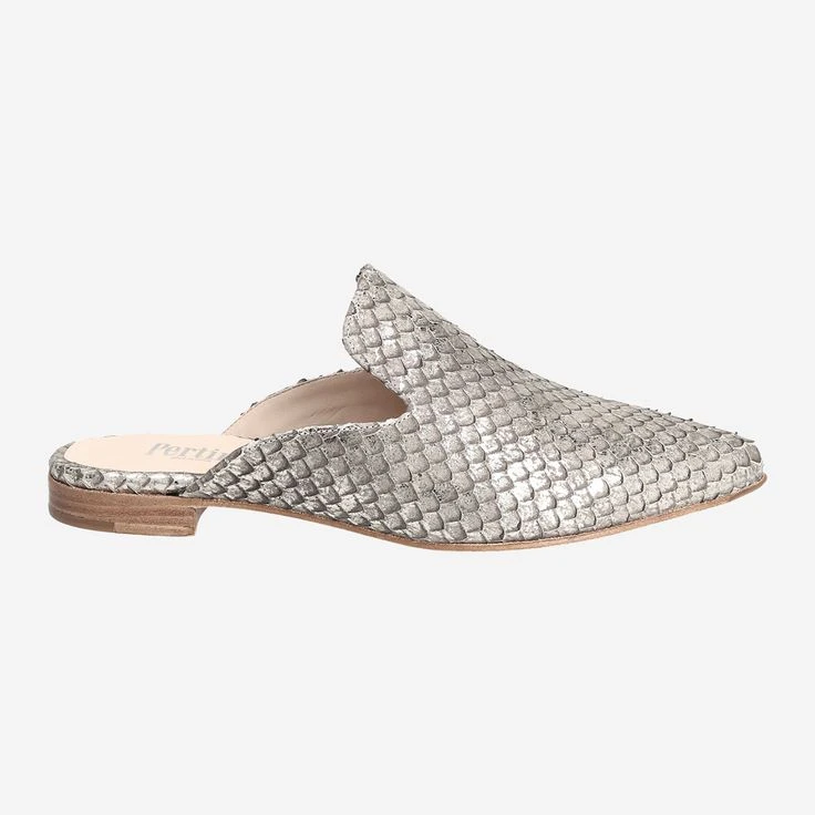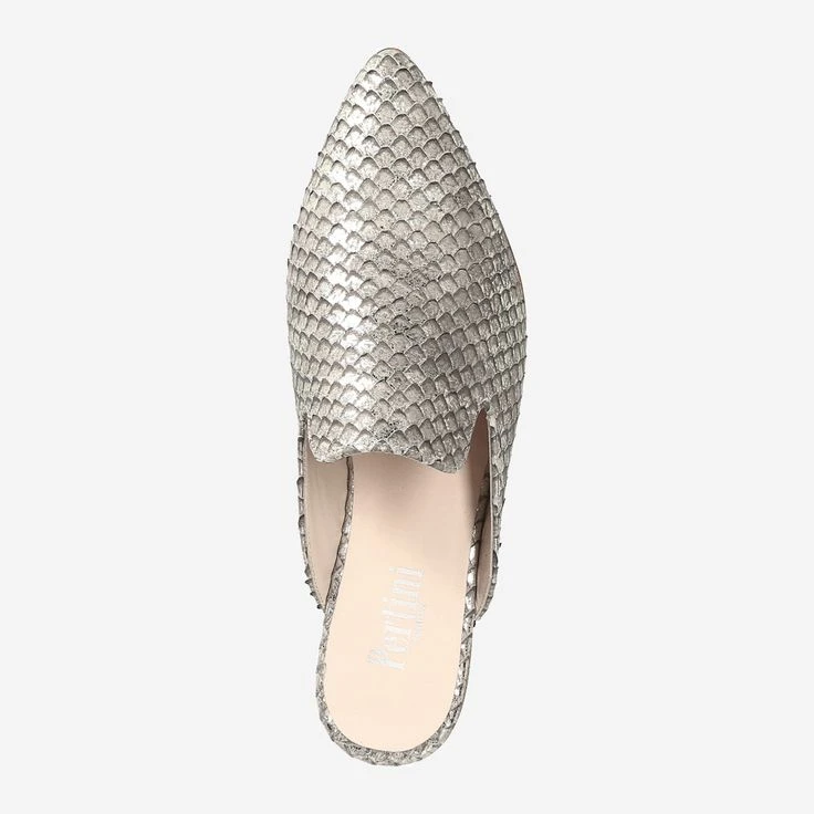 Mules in all shapes and colors are the trend this year. We love that comfort and style go hand in hand with this type of shoe. Combine the modern mules with a pantsuit, dress or skinny jeans. There are no limits to the possible combinations. You will love the diversity and wearing comfort and no longer want to miss. This variant of leather with silver reptile look of the brand Pertini is elegant and fashionable at the same time.