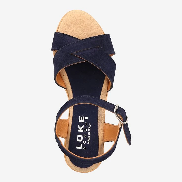 This chic women’s sandal from Schuhe Lüke scores with trendy dark blue, a wedge heel with a comfortable height and high-quality leather that was used in the processing. Perfect shoe for the summer.
