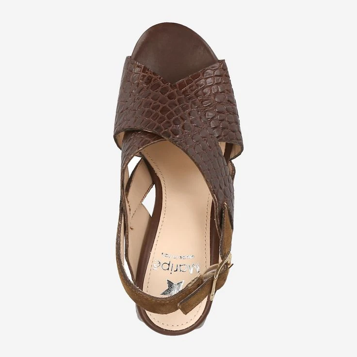 Do you love to enjoy a stylish appearance? With this sandal from Maripé this is guaranteed for you! The leather of the wide straps is exclusively embossed in reptile look to create the unique look. The wide block heel exudes additional sophistication through its semicircular shape, which underlines this brown sandal in your charm.