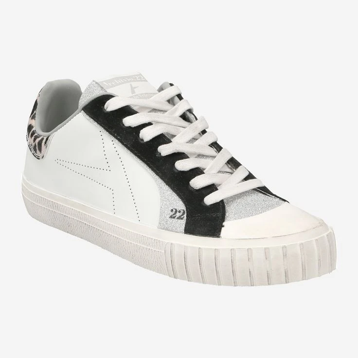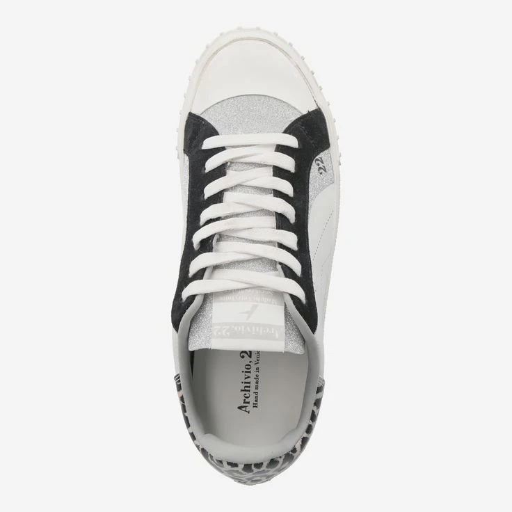 Archivio 22 relies on clearly defined contrasts to elaborate the character of each shoe! The glamorous look of glittering, silver-coated leather forms an exciting contrast to the white sole with used effects in this model. Lovely details, such as decorative perforations, leo look in the heel area, as well as logo applications give this Italian shoe individuality, as well as playful lightness.