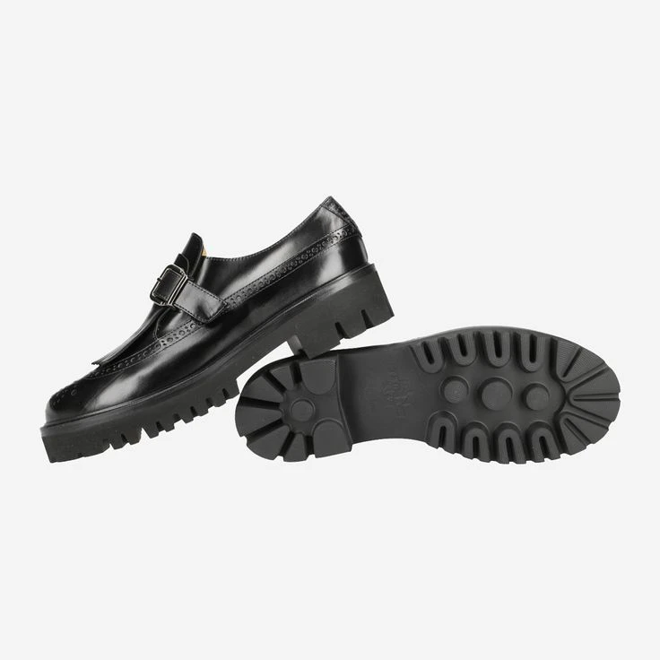 - Block heel, metal closure, decorative oat tab, decorative perforation, lyra perforation, stretch insert, monk shoe