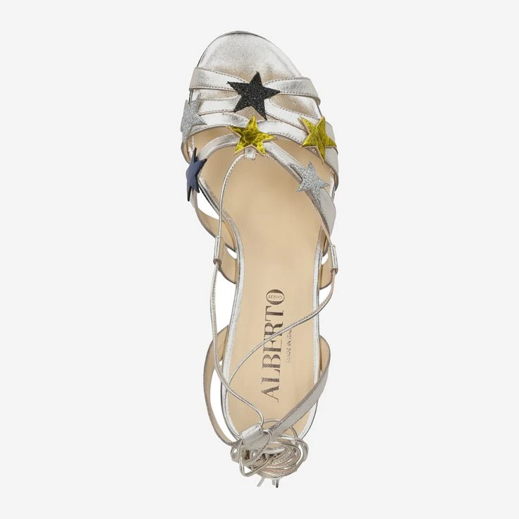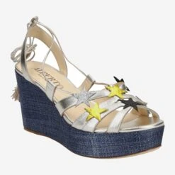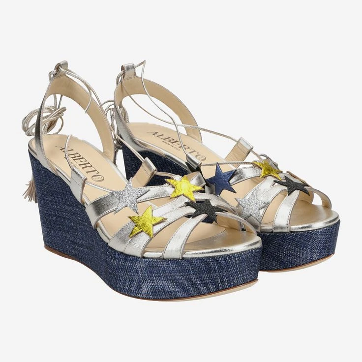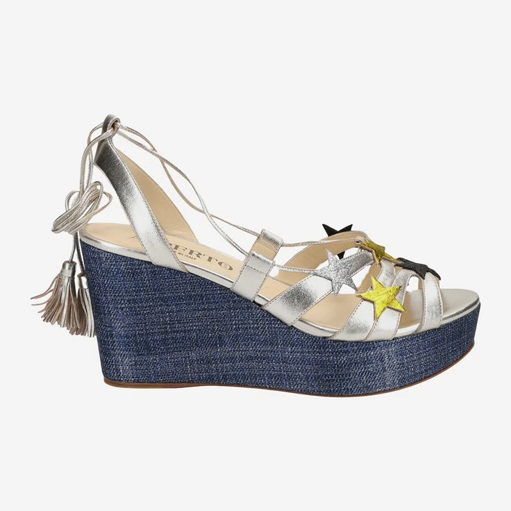 Alberto Gozzi has obviously taken stars from the sky and incorporated them into these expressive wedges. The heavenly design is rounded off by a 90 mm high heel as well as the finest quality and perfect fit. The contrast to the shimmering stars is provided by the sophisticated wedge heel in jeans look. For all fashionistas who want to go high, a must.