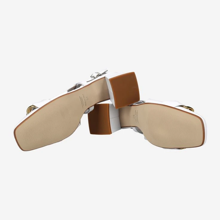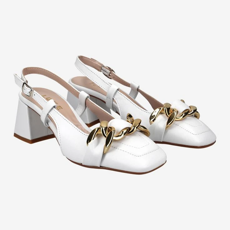- Metal closure, block heel, jewelry application in gold chain look, leather straps, stretch insert, breathable