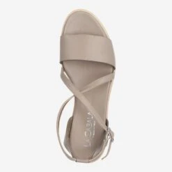 Simple style with skillful details. The light gray sandals from La Cabala not only offer a perfect basis for colorful summer outfits, they also guarantee the highest wearing comfort and best support. The graceful leather strap that extends once from the top of the foot over the heel perfectly matches the wide strap at the toe cap. Both contrast each other in shape and bend, creating a simple but interesting image. The wavy sole completes the picture harmoniously.