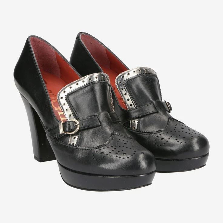- lyra perforation, metal closure,, decorative stitching, platform sole