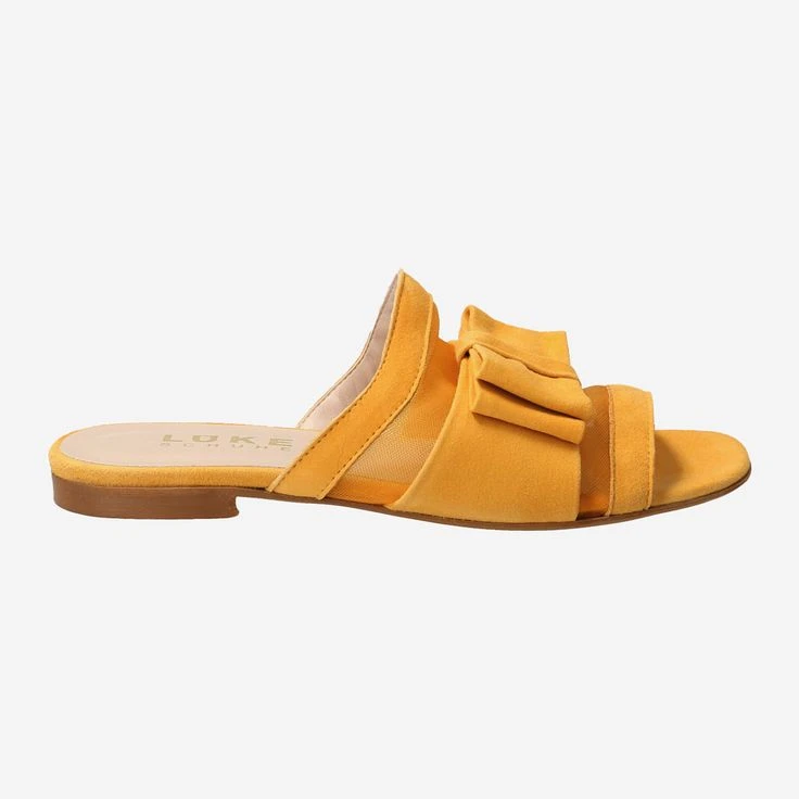 This exciting women’s slip-on shoe from Schuhe Lüke in a trendy mustard tone scores with a special look that will turn your outfits into eye-catchers in no time. Suede, mesh to look through and a wide decorative bow skillfully placed on the instep help. Perfect for the summer.