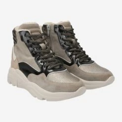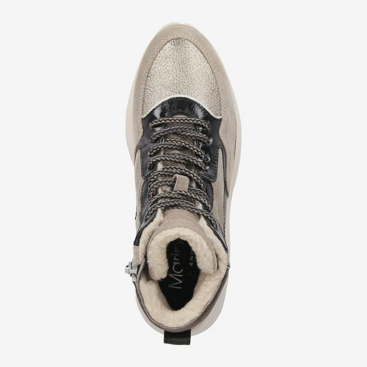 Look forward to this very special gem of the current collection of MaripĂ©! The small manufacture makes this chunkey boot „Ragusa Var.1“ from beige suede, which is refined by areas in different textures. Coated leather in gold metallic, a heel section in a quilted design, and black contrasts make the look particularly exciting. The shaft area and tongue are complemented by fluffy warm lining (100% polyester). The inner lining is made of leather, which gives you a breathable foot climate.