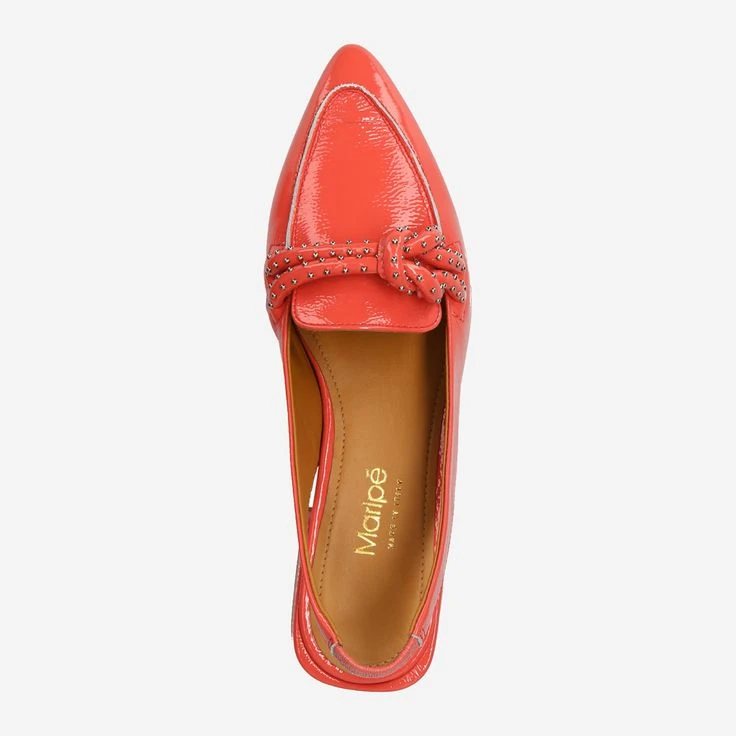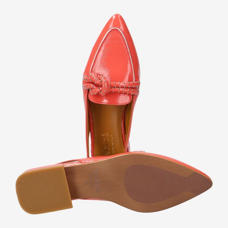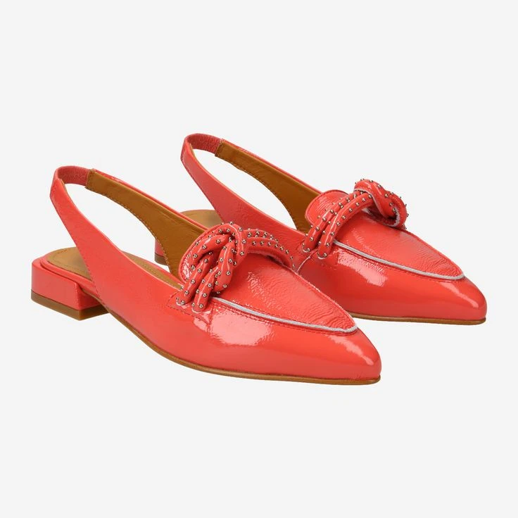 Extravagant, rocking, feminine, extraordinary: if you like to play with these attributes, Maripé has just the right model for you: SILVIA. This new sling pump captivates with coral red patent leather, feminine design and noble details. The loafer typical application in loop form is refined by numerous, silver-colored micro rivets. The narrow heel strap offers you a comfortable hold thanks to a stretch area. And by the way, your chocolate side is skillfully put in the limelight! Use them wherever you want to playfully convince with style and expression!