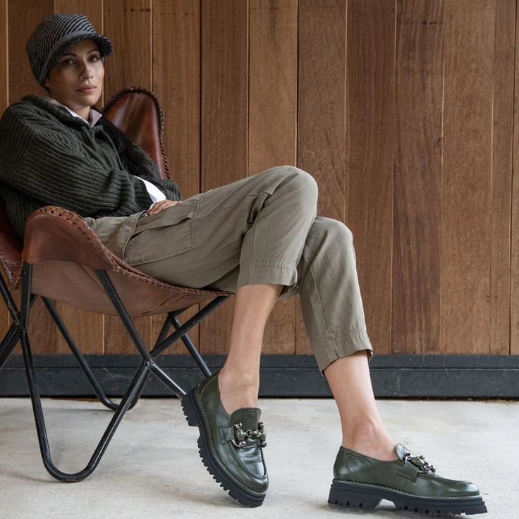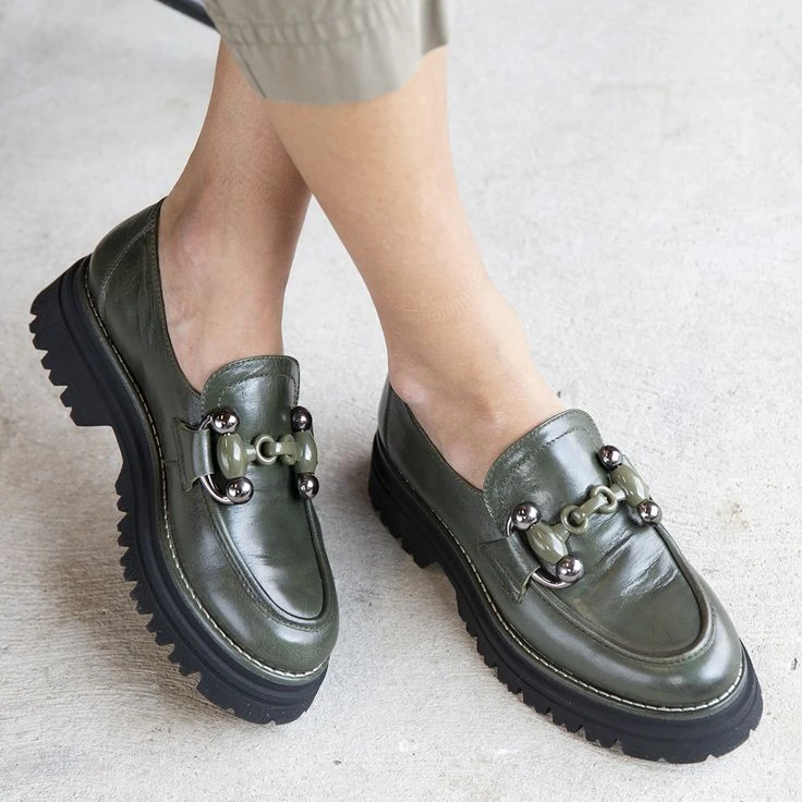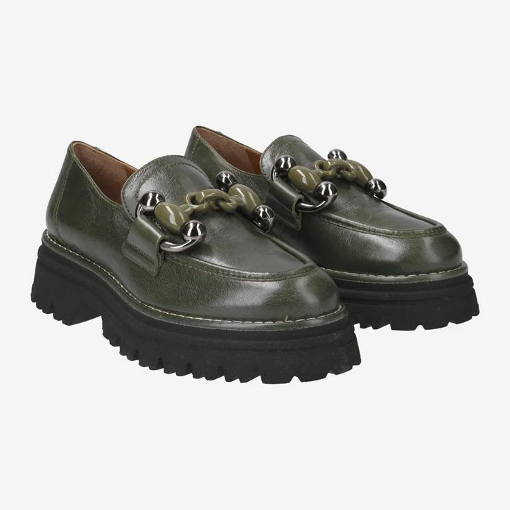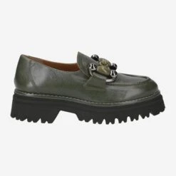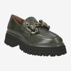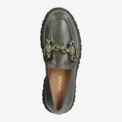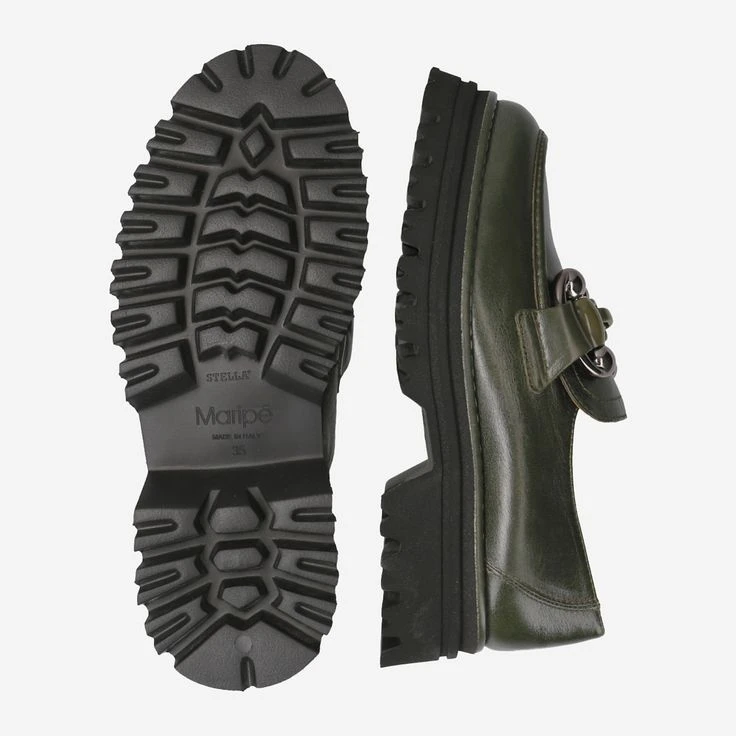 The penny loafer has long been a fashion statement! They show a sense of tradition, a desire for an exciting mix of styles and a casual playfulness towards masculine elements. And that’s exactly how fashion works these days! MaripĂ© interprets the all-rounder in the UMA model with a striking platform, green, coated smooth leather and a loafer application in the style of a horsebit buckle.