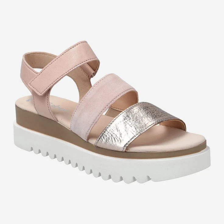 - Individually adjustable, Velcro closure, decorative stitching, platform sole, leather straps