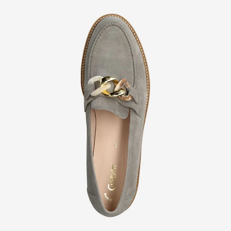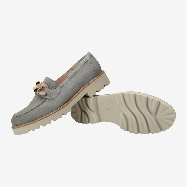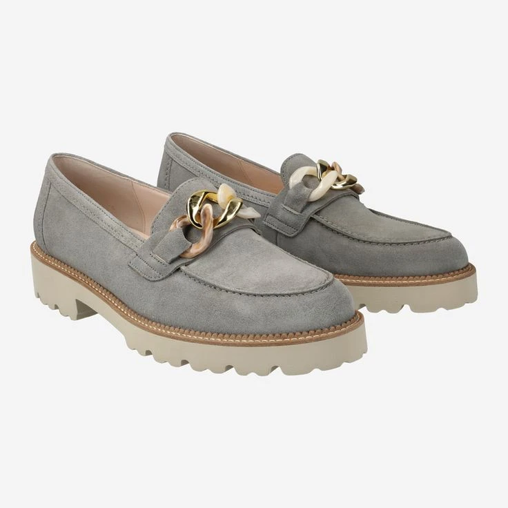 - Block heel, loafer application in trendy chain look, contrast stitching along the last, breathable
