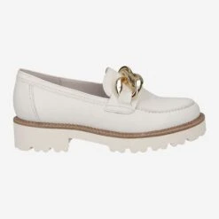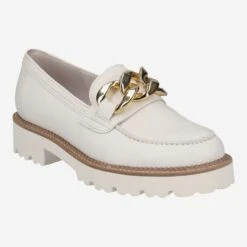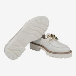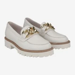 The gold-colored, oversized chain application makes this creamy white penny loafer the statement shoe of the season! Because this „it-piece“ is at the start of all fashion shows and coins a whole new trend! In combination with classic design, an exciting contrast is created. Fashionistas like to combine monochrome looks or light academia styles with this cream piece!