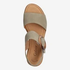 This gray-green wedge sandal by Gabor is your ultimate wild card for the upcoming summer season! You enjoy butter-soft suede that adapts to your foot individually. You close this enchanting sandal quite practically by a Velcro closure. The decorative buckle serves here as a decorative eye-catcher, and rounds off the urban look skillfully.