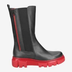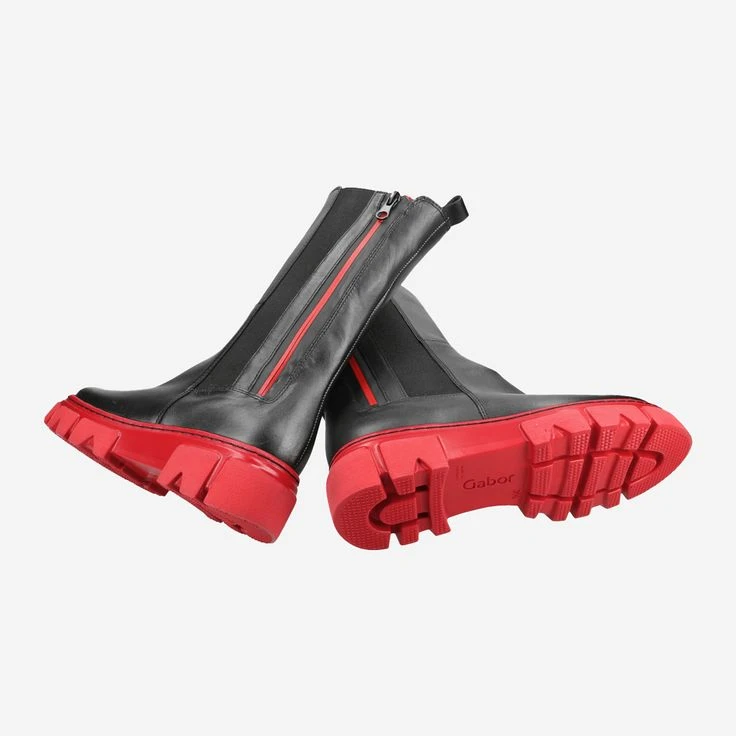 - Exchangeable footbed, suitable for insoles, zipper, block heel, platform heel, contrast stitching, stretch insert, 1x functional zipper, 1x decorative zipper with red contrast stripe, red sole in industrial style, entry loop, warm lining