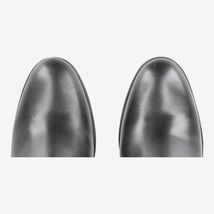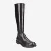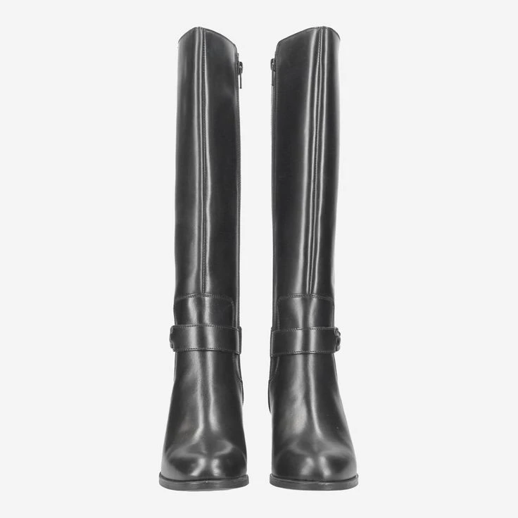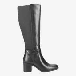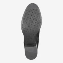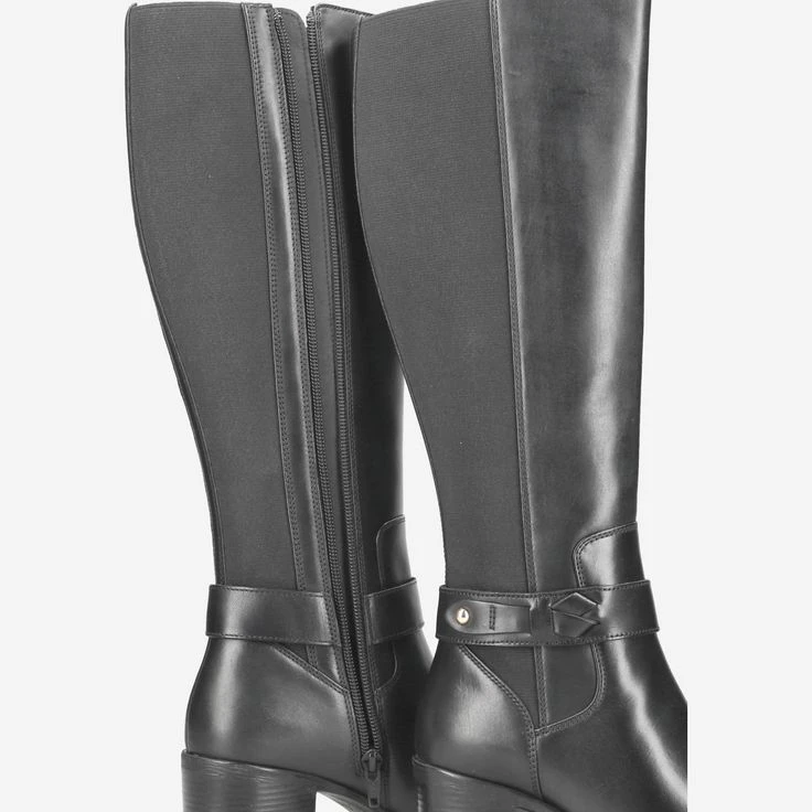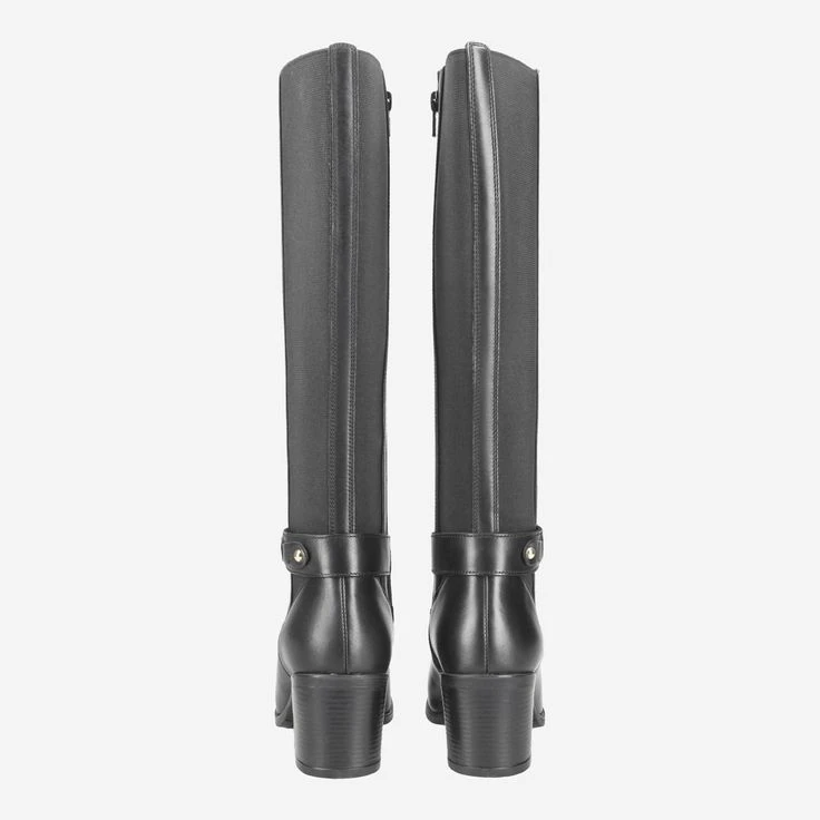 - Zipper closure, block heel, stud appliqué, leather appliqué, decorative stitching, stretch panels along entire back for adjustable fit at calf