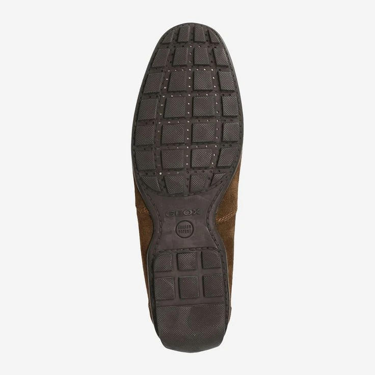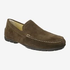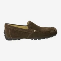 Dark brown men’s loafers from Geox. The upper is made of nubuck leather, the lining is lined with leather. The loafers have a leather cover sole and a rubber sole. Stretch inserts facilitate entry and contrast stitching and a discreet logo embossing are also incorporated.