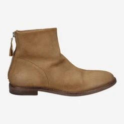 Individuality. Authenticity. Handmade. This is what distinguishes this ankle boot from the MOMA manufactory. The model „Marrone“ is made of brown suede, which has been refined in a vintage look. The authentic character of this particular shoe is further complemented by a zipper on the heel. The leather application on it perfectly matches the overall look of the shoe. The stitched-through sole is partly made of leather, rubber areas give you support. This shoe has a special character, look forward to it!