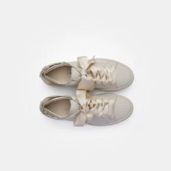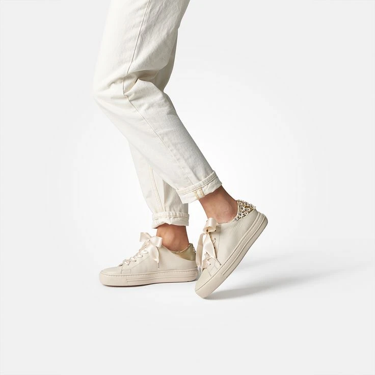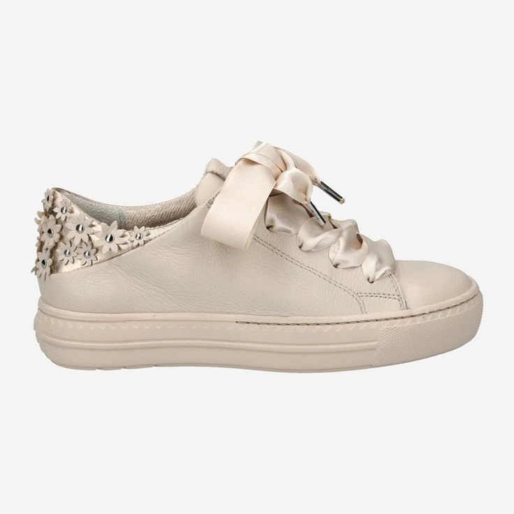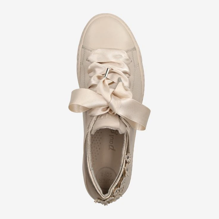 With pretty style and a romantic touch, these SUPER SOFT Pauls from Paul Green present themselves. The playful sneakers made of beige smooth leather with detailed flowers on the heel bring charming flair to your wardrobe. With the matching satin ribbon an absolute eye-catcher. A super soft leather terry lining optimizes superb comfort. Discover this pair for hip looks! Each Paul Green shoe is handmade in up to 160 steps and then inspected. This ensures that it meets the high standards of fit and quality.