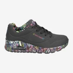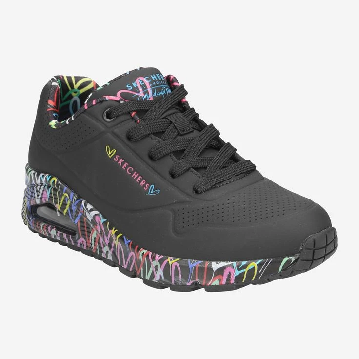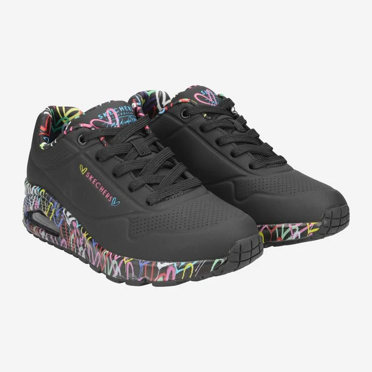 LOVE is the motto of this artistic sneakers from Skechers! What could be more beautiful? In collaboration with the muralist JGoldcrown, the black model „Uno Loving Love“ inspires with iconic „Lovewall Design“, with countless, colorful hearts on the sole! In addition to the unique design, you’ll enjoy an Air Cooled Memory Foam® insole, as well as visible Skech-Air® air cushioning. True to the motto, you will LOVE this lace-up shoe!, Reduced single pair!