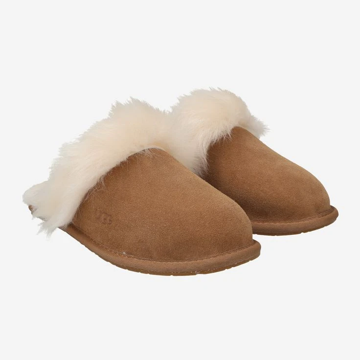 With this cuddly soft slipper from UGG you enjoy dreamlike comfort! The natural sheepskin gives you optimal cushioning, breathability and a balancing foot climate. The cognac-brown suede offers an enchantingly beautiful contrast to the natural white of the sheepskin, Reduced single pair!