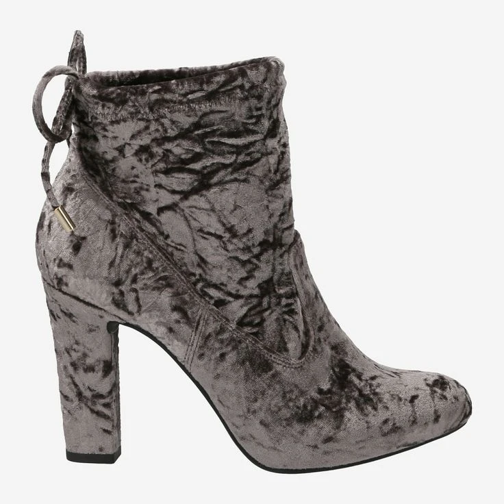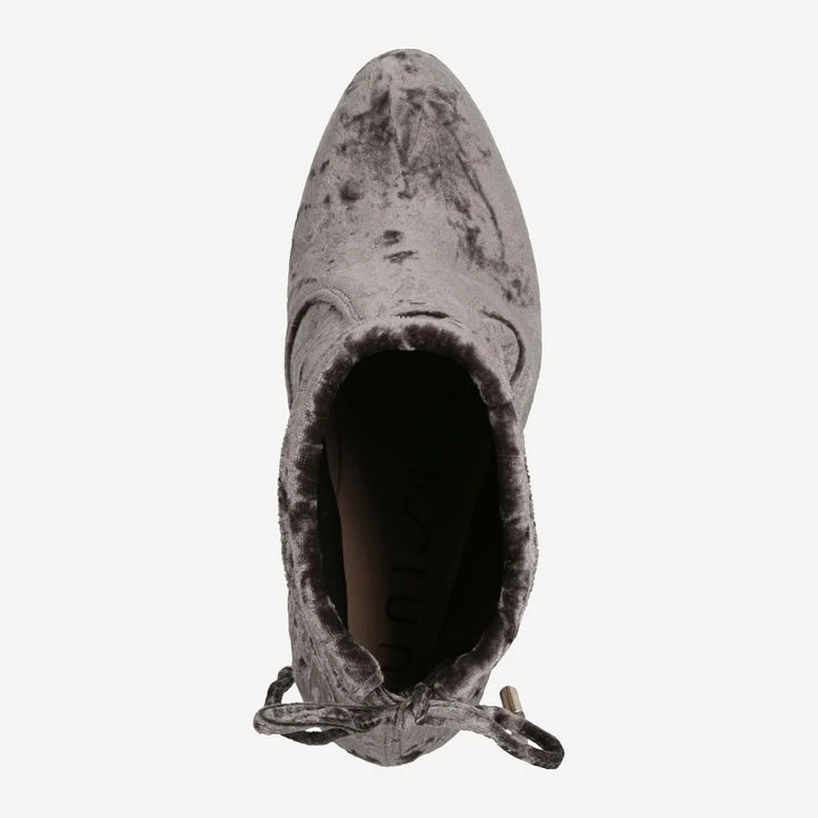 This high heel from Unisa is an absolute eye-catcher. With its surface material of shimmering velvet, it makes itself a unique style object. The noble gray thereby underlines the cool look, perfectly combined with a velvet ribbon on the back of the shaft, which loosens up the straightforward design in a feminine way. Its heel height of 10 cm makes it look expressive, feminine and perfect for special occasions. The shaft height is 13 cm and provides a visually rounded design.